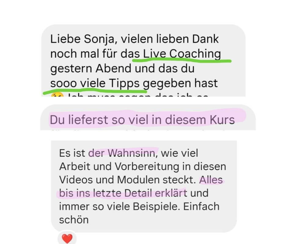 Wenn du mal nicht live dabei sein kannst, aber dringend eine Frage hast, die nicht bis zum nächsten Termin warten kann, ist das kein Problem: Schick mir deine Fragen einfach vorher per Mail. Ich beantworte sie im Coaching und schicke dir im Anschluss die Aufzeichnung. 🎥